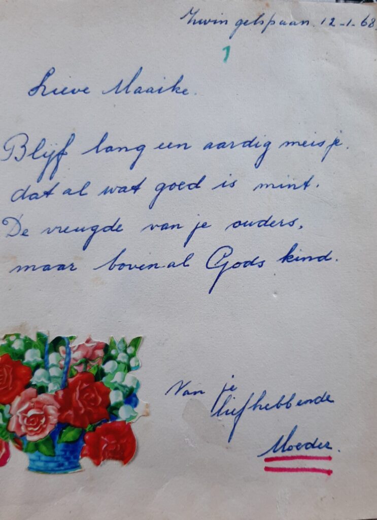 Blijf lang een aardig meisje. Dat al wat goed is mint. De vreugde van je ouders. Maar bovenal Gods kind. Na mijn moeder schrijft mijn vader een Godvrezend gedicht. Het Bijbelse gehalte is sowieso erg aanwezig in mijn kinderjaren.