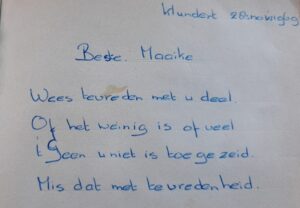 Het eerste versje is van ‘je zusje Mija’, toen 12 jaar. Haar handschrift is niet eens veel veranderd. Dan komt ‘je broertje Wim’: In de hemel leven engeltjes. Op de aarde zijn er geen. Daar zijn alleen maar bengeltjes. En daarvan ben jij er één. Je mag als grote broer een beetje plagen.