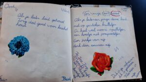 Mijn poëziealbum beslaat dik vijf jaar. Het eerste versje is van 21 december 1967, het laatste is geschreven op 24 maart 1973. Ik was mijn verjaardagscadeau bepaald niet na een maand al kwijt! Niks waan van de dag! Het album heeft alle verhuizingen overleefd. De vriendschappen, die in het boekje worden bejubeld, hebben de tand des tijds helaas niet doorstaan. Het idee van een poëziealbum daarentegen is springlevend. Mijn dochters hadden vriendenboeken; tegenwoordig maken we gebruik van allerlei social media. De wereld is niet meer zo overzichtelijk als in de versleten schriftjes en boekjes van vroeger, maar de intentie is onveranderd, hoop ik maar. Je wenst iemand het beste en laat weten er altijd voor diegene te zijn. Ook als het niet lukt is dit een mooie gedachte.